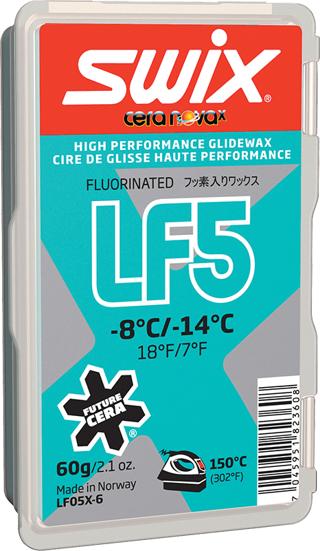The 5 series is brand new for the Cera Nova X line, and fulfill a hardness gap between the 4 and the 6 series. It’s easier to apply than the 4 series, but provides outstanding glide properties within its temperature range, and has a great durability. LF05X can be used as a race wax alone, but is often used as a base for Cera F powder, such as FC05X.